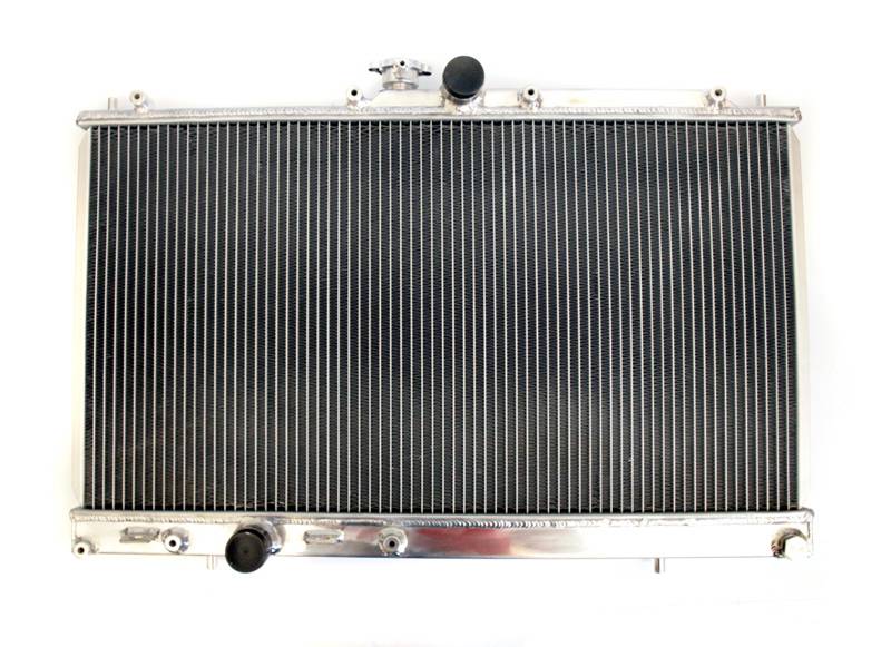 The all aluminum radiator features a high pressure radiator cap, aluminum construction, and mounting tabs for a direct OEM replacement. The factory fans and radiator hoses will fit with no modification. This kit is very easy to install and should only take about 1 hour. The core dimensions for this aluminum radiator are 28.25" x 17.75" x 2.36". That is almost 25% bigger then the stock unit. In addition to having a larger cooling capacity, the aluminum radiators are much more durable then stock. The factory plastic end tanks can crack under extreme heat and pressure. Under racing conditions, your water temperatures can near boiling points. As tested under the intense Arizona heat conditions, the aluminum end tanks and larger core size help keep the temperature down by at least 15F degrees.