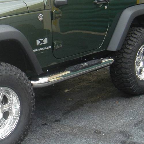 Tube steps for the new 2007-08 Wrangler are custom designed for the oversized features of this hot new vehicle. Unlike smaller tube designs, these large round tubes provide a much cleaner look and are not �dwarfed� by oversized tires and body style. Rugged Ridge Stainless Tube Steps feature prime 304L, .05� wall stainless tubing polished to a mirror finish. The polishing process for a Rugged Ridge step is longer and deeper pulling out the deepest shine from the steel. A true �deep polish�! All Rugged Ridge Tube steps feature no-drill installation for ease of installation and a truly custom fit. All Tube Step Installation brackets are constructed of durable 3/16� powdercoated steel for long life and years of flex-free use. Each Tube Step features special UV treated no-slip step pads with 5 mounting pins. These step pads are installed on top of the tube - no exposed metal to rust.